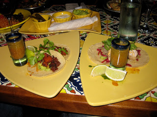 While the margaritas looked amazing and massive, we decided to take the more cost effective sangria approach and were happy to find that it was delicious (the strawberries were a nice touch). Even more delish was the food. From the moment they put the chips and salsa on the table, I knew I was in for a good meal. I know you must be thinking that every Mexican restaurant places a complimentary basket of chips and salsa on the table so this is no big deal, but this salsa had a touch of cream and was ultra-yummy. We devoured our basket in under 2 minutes. We decided to share a plate of chorizo nachos for the table. Wonderful. Ample amounts of melty cheese and meat. They also topped the dish with jalapenos to add a little spice, but they were pickled and, therefore, not too overpowering. For the main courses, Dave tried a carnitas burrito, Dana and Simon got fajitas (shrimp and steak, respectively), and I got 2 orders of tacos (Grilled Mahi-Mahi with aioli, cheese, and salsa and chicken with guac and pineapple salsa). As I re-read that sentence, I realize I sound like a Fatty Boom Batty, but let me warn you, the taco portions are small. Although the tacos come two to an order, they are tiny, and I was right to order 2. The other entrees are definitely of adequate size. In fact, the burrito came with enough rice and beans to serve as a meal in itself.