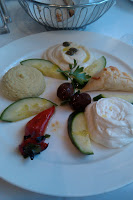 - Course #1: Meze Plate – Heaping portions of fava bean hummus, taramosalata, and tzatziki served with cucumbers, olives, a pepper, and a mini spanikopita. Ridiculous. Do not pass this up. Every dip is amazing. The tzatziki is unreal. I had no idea they could make yogurt this thick.