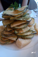 The meal was as good as ever. Actually, this time it was better because we sprung for an extra appetizer for the table. After sitting down, we noticed a server placing an impressive structure on a neighboring table. After our waiter described the Milos special – a tower of lightly fried, paper thin rounds of zucchini and eggplant surrounding more of that luxurious tzatziki and garnished with cubes of fried cheese – there was no way were were turning back. Bring it to us now, we said. It came to the table looking like Jenga for veggies. If all kids were told they could topple a tower of “chips”, pick them up with their hands, and dip them in some of that yogurt, they would all eat their veggies.