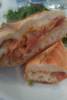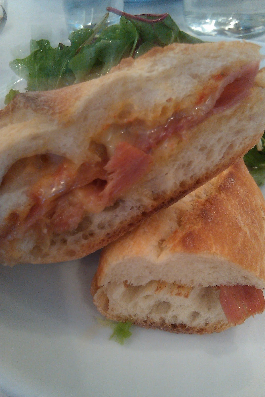 When a restaurant is named egg, you pretty much know what you’re going to order.  I figured it would be blasphemous to order anything other than the restaurants namesake, so I chose the eggs rothko (easy-cooked egg in brioche, topped with grafton cheddar, served with broiled tomatoes and a side of meat).  Sounds good, right?  Too bad they were out of brioche and regular bread just didn’t sound as special.  If I’m gonna do it, I’m gonna do it right so I scratched the eggs and went down the completely opposite road: lunch fare.  I told you they specialize in Southern food and I saw my favorite Southern item on the menu: pimento cheese.  I ordered the ham and pimento cheese sandwich, served on grilled baguette.  The ham was more like prosciutto and was salty enough to stand up to the slightly spicy pimento cheese.  Jen ordered an egg and chorizo biscuit whose filling was spilling all over the plate.  Yums all around.