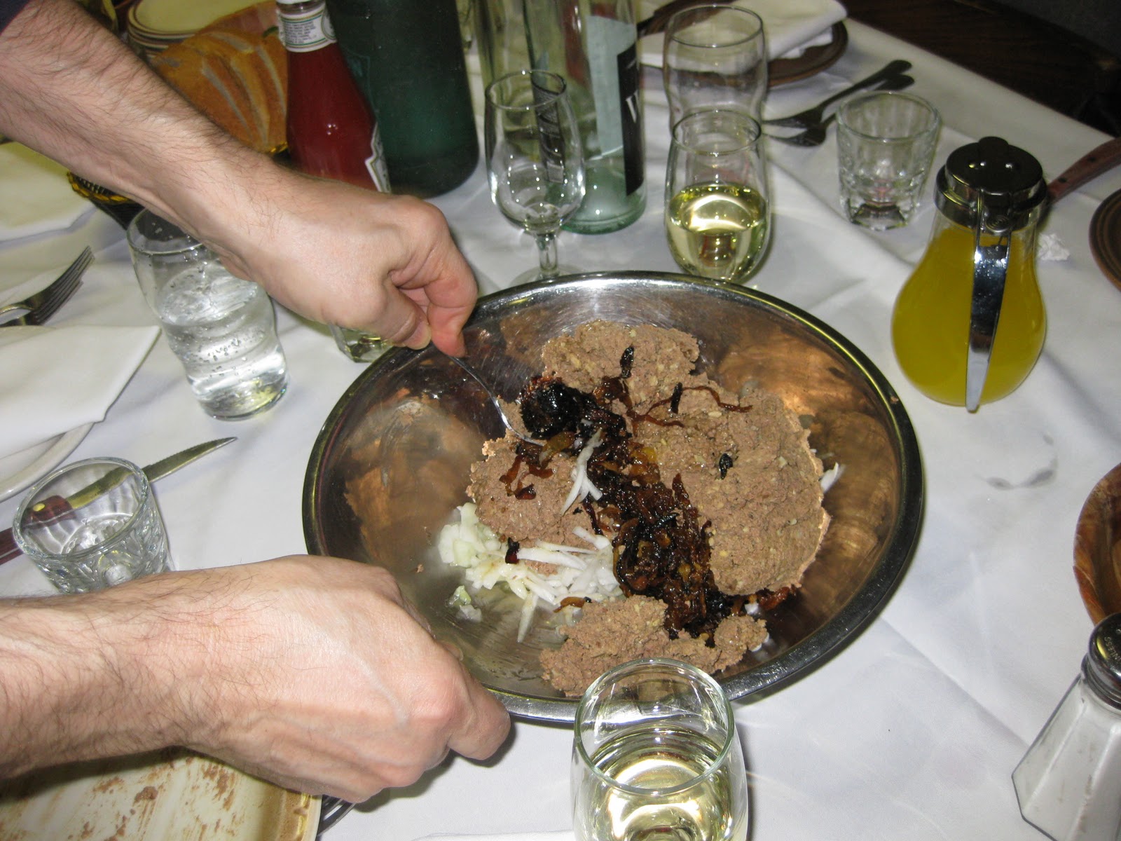 - And the dish of the evening: chopped liver. It was mixed tableside (with a nice bottle of animal fat) so I’m thinking it’s the poor man’s caesar salad. Most of the people in our group shied away from this one, but I had no fear. I have to admit, it looked gross but didn’t taste too bad. However, between this dish and the garlic-filled steak, your breath will not be in the best shape, so bring lots of gum and maintain a safe distance from potential suitors.