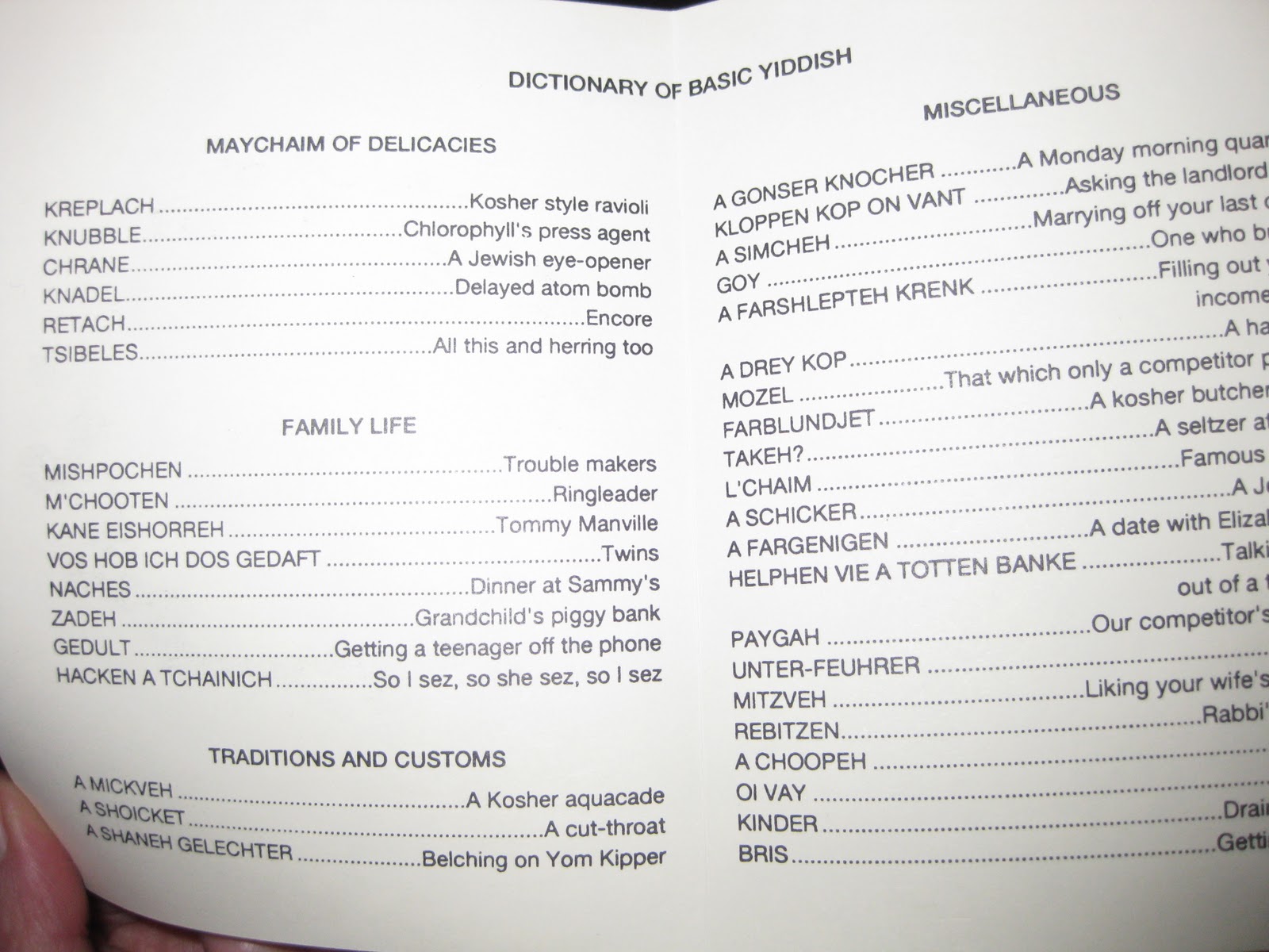 - For those un-initiated, aka: non-Jews (or in the case of moi, a Jew who grew up around all non-Jews), there is a Yiddish dictionary on the table. I found it quite helpful.