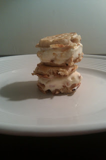 For dessert I made tiny ice cream sandwiches using mini vanilla waffles (from the freezer section) instead of cookies and Ben and Jerry’s Peach Cobbler ice cream as the filling (peach ice cream with cinnamon sugar shortbread pieces and a peach swirl). Talk about the easiest dessert ever that can be quite a stunner for entertaining, especially if you dust with powdered sugar (which I did not because I was just sitting at home by myself).