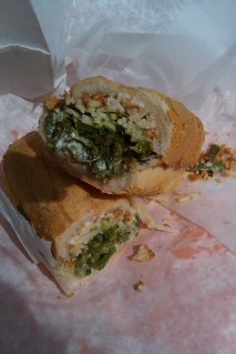 I found a great spot in the park that was only mildly tainted by the trashy parents lounging next to me who kept yelling at their kids. Once settled, I opened up my sandwich and hunkered down. Inside the crispy french bread was asparagus, granny smith apple, cashews, cilantro, and mayo. If all meat-free food tasted this good, I would become a vegetarian. The roasted asparagus was sturdy enough to take the place of the meat and the tart apples brought the sandwich into funville. Amazing.