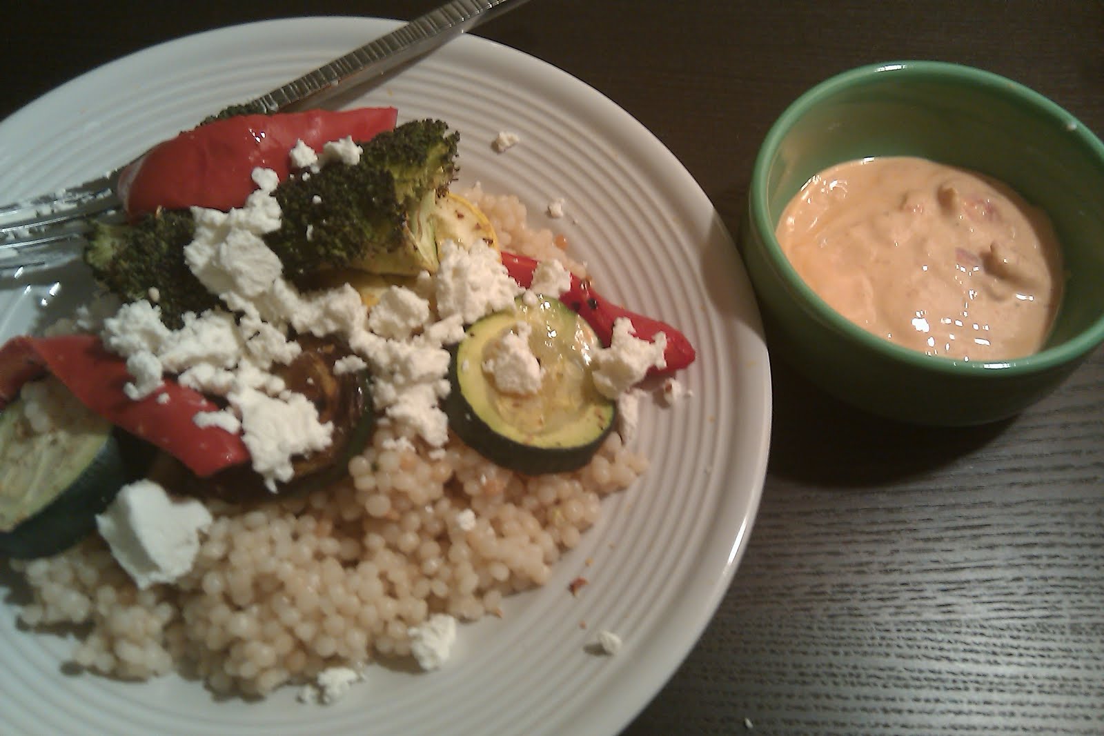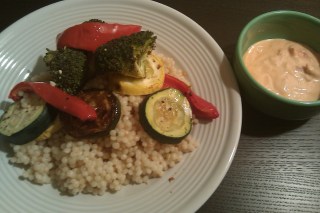 I was able to grab a variety of veggies from the bodega (squash, zucchini, broccoli, and bell peppers – basically, I made sure it was colorful). I drizzled some olive oil and seasoning on top and roasted with a clove of garlic while the couscous did its thing in the rice cooker and I hopped in the shower. By the time I was out of the shower and settled in comfy clothes, the veggies and couscous were both ready. I took a couple of the roasted bell pepper pieces and the roasted garlic clove and put them in a blender with 0% Greek yogurt to make a nice little sauce.