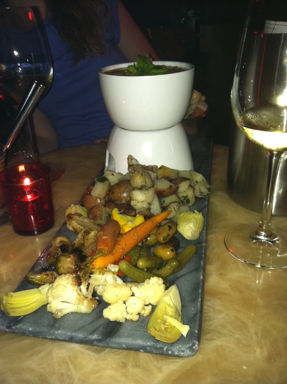 Lets start with the drinks.  I spied some interesting champagne cocktails, Belgian beer cocktails, sangria, champagne punches, and wine.  A drink is a must when you’re at Bourgeois Pig because it just adds to the decadence of the meal.  The apps all looked good, but I did not feel like a cheese board was necessary when the main course is cheese fondue.  Lindsay and I split the lobster bisque fondue because the seafood stock looked like it was going to take this fondue to new heights, and it did.  The fondue came with so many different things for dipping that you still feel like you’re getting a full meal.  Ours came with toasted French bread, rosemary potatoes, roasted vegetables (cauliflower, carrots, brussels sprouts), artichoke hearts, olives, and cournichons.  Everything was sumptuous – how can it not be when you’re enjoying fondue and wine on soft, velvet couches?  I felt like a queen.  Let them eat cake fondue!