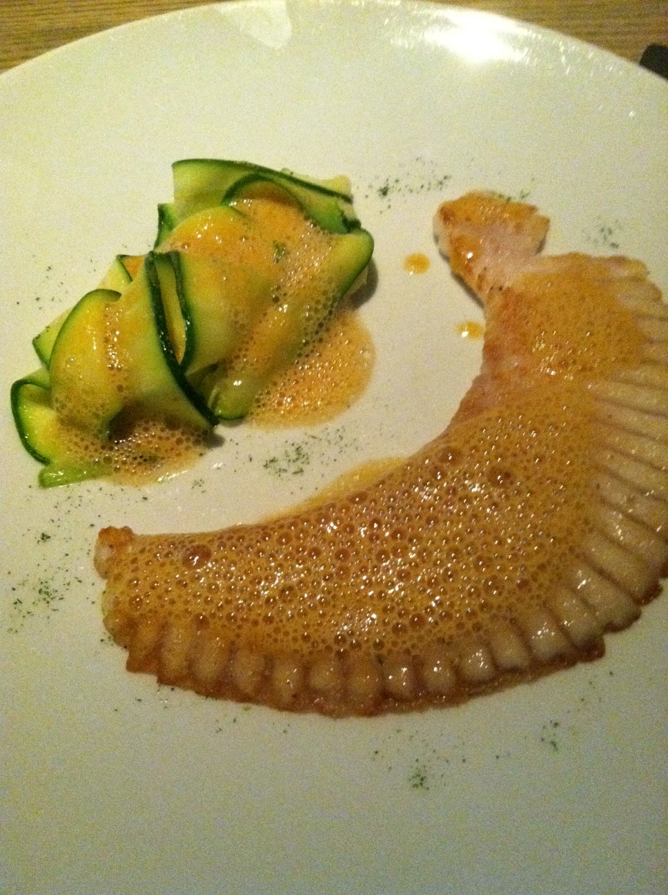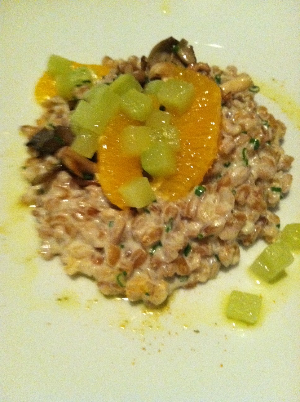For the entrees, we got the skate with zucchini ribbons and sherry foam and the farro risotto with orange, cucumber, and mushrooms.  Two great choices.  My first taste of skate wing was a hit, even more so when I realized what it was.  Skate is a type of ray (as in sting ray), so I was eating one of the flat flappy things you see on those guys.  It’s a thin piece of fish, so it is important (to me) that it is not over-sauced, and the sherry foam was just light enough to flavor the dish without making you forget you were eating fish.  The farro risotto was a very interesting dish.  All the ingredients in normal risotto were swapped out, but the end result was similar to what you would expect.  Instead of rice, we had farro, which gave the dish a nuttier taste with more to chew on.  Instead of cream, [I think] it was made with tangy Greek yogurt.  It just worked, as did the toppings.