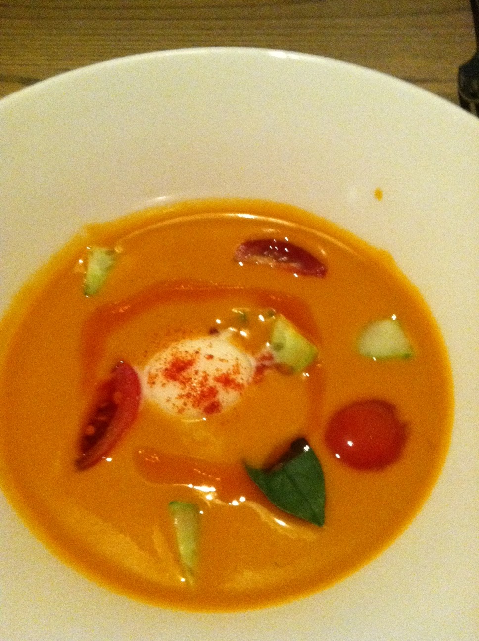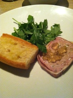For the appetizer, we got the tomato-cucumber gazpacho and the pork and duck terrine.  I’m not sure how they packed so much flavor into the muscat wine gelee that accompanied the terrine, but it was some seriously strong flavor.  It was too much on its own but added a punch to the salty terrine.  The gazpacho was ridiculous.  I have never had a creamy gazpacho before but I loved it.  All the garlic-y flavor was still there, but this had an Italian twist with basil and some buffalo mozzarella.