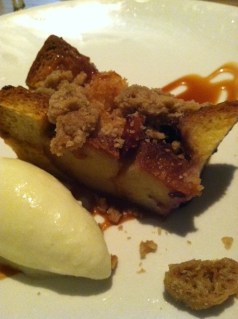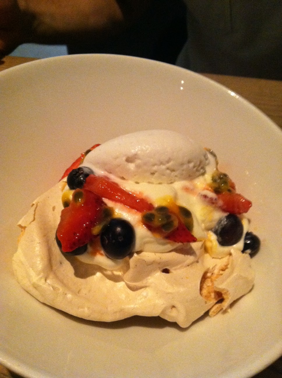 For dessert we got the peach and blueberry bread pudding with creme fraiche sorbet and the pavlova (meringue cake) with fresh berries, passion fruit, and coconut sorbet.  Both served as the perfect end to the meal.  I take that back.  The perfect end to the meal were the glasses of dessert wine the waitress brought to our table on the house since we had to remind them to bring our sangria earlier in the meal.  That’s service.