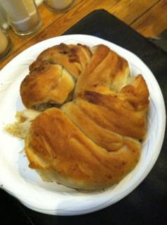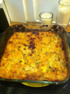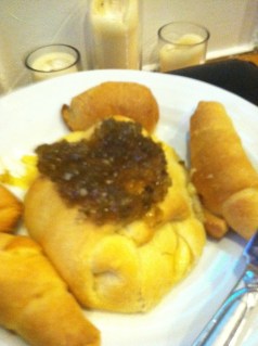 The action started around 2:15, which is when Greg handed me my first bloody mary, prepared with juice shipped from New Orleans and garnished with spicy pickled green beans and okra.  Next came Matt and Jen’s bakery purchase: lard bread.  Yup, there is actually such a thing as lard bread and it’s phenomenal.  It’s this greasy, yeasty, bread with chunks of pork.  Manna from heaven is what it really is.  Or it would be if the Jews walking the dessert had eaten pork.  Matt also prepared a baked gouda with homemade jalapeno jelly.  I’m not sure how Matt finds the time to make jelly from scratch and tend to all those urology patients.  I don’t plan to ask for fear that he reprioritizes and decides jelly no longer makes the cut.  The final appetizer was a product of my kitchen: Southwestern artichoke dip.  Very similar to regular artichoke heart dip, but with corn, paprika, and cayenne added.  I followed the recipe I got from Big Girls Small Kitchen, but I think it could have used a little more cayenne.  Definitely something to remember for next time since I plan to make it again.  It was a great way to mix up a good but expected party recipe.  For the main course, Greg and Susan prepared shrimp and sausage gumbo as an homage to Katrina, the hurricane that set the bar.  After that, we had a small interlude where we sipped on Hurricanes and let the food settle before we tackled dessert, Jen’s peach cobbler.  All the food was amazing though I think the pancakes we had as a movie snack put me over the edge.