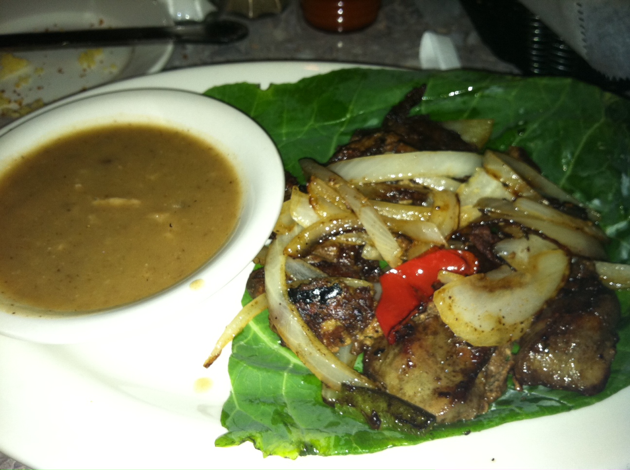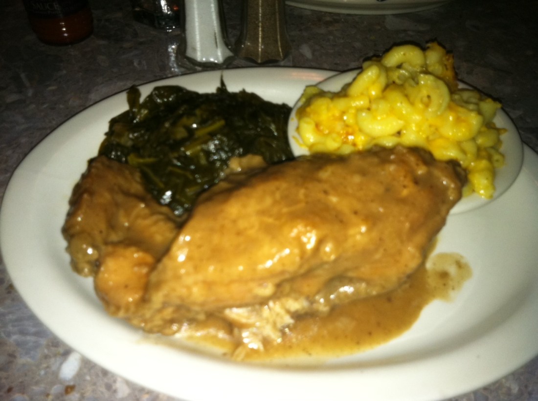 I began drooling the moment I sat down and scarfed down two pieces of sweet cornbread in seconds.  Even though the fried chicken plate I ordered promised to be huge, I saw chicken livers on the menu and could not help myself from getting an appetizer.  You may grimace at the idea of chicken livers, but I grew up eating bowls of them.  Only when Mildred prepares them, she also makes them with the gizzards and cooks them with onions in gravy, called “lizzards and gizzards.”  The livers at Sylvia’s also came with onions, but the gravy (and a dang good gravy it was) came on the side.  Of course, I poured it over the whole plate to best mimic the Mildred style.  They tasted very different from Mildred’s, as if the livers were seared, but it was a perfect appetizer.  I like to think of it as the poor man’s fois gras.