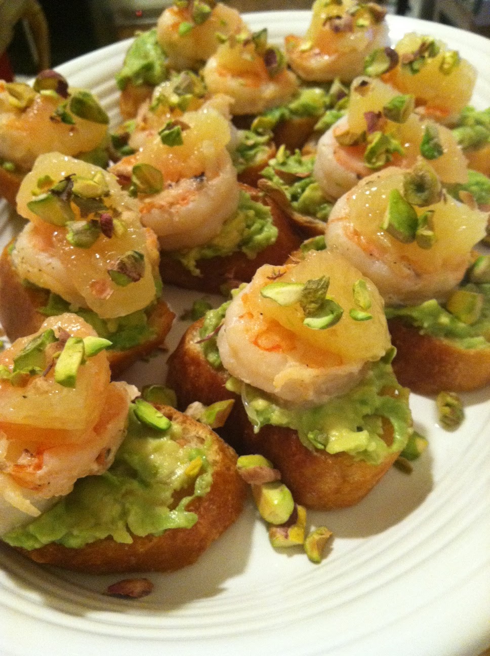 | Seared shrimp bruschetta with avocado, grapefruit, and pistachios |