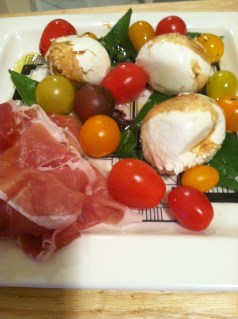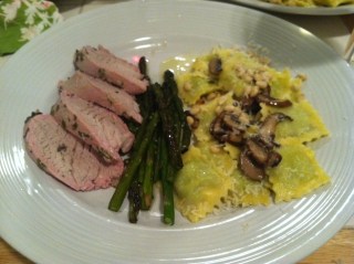 The people at Eataly should love me because I bought all of the ingredients for dinner there. It all started because I knew I wanted some of their fresh pasta and the menu just grew from there. Most of the dishes I made were simple (after all, I had to prepare the whole meal in only about an hour and a half on a Friday after work), but I made sure to use all high quality, fresh ingredients. When you’re working with great products, sometimes simple is best to let the ingredients shine. After the dinner and two bottles of wine, I think Matt and Karina enjoyed themselves and hope it showed them how happy we all are for them.