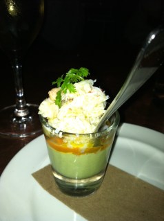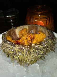 As a native of the low country, I am not used to oysters being expensive fare. $3 for an oyster seems outrageous to me. At home they are a fraction of that price, I suppose just one more perk to living in the South. Here, however, oysters are nowhere close to cheap so while Dan and Brian each ordered the happy hour special, I decided to get two appetizers in the hopes that I would get more for my money. That plan didn’t really work since the appetizers arrived and were miniscule. They were, however, delicious. I ordered the sea urchin with pomegranate and the chilled crab with avocado. My first taste of sea urchin was a delight. I imagined it would be slimy, but the texture was not at all off-putting. It was so light, I could barely feel it sitting on my tongue. It tasted slightly of the ocean with a faint sweet flavor that was nicely accented by the sweet pomegranate. The presentation inside the spiky shell was simple but elegant. The second appetizer was also of cute proportions and served inside a shot glass. A thick layer of avocado mousse was topped by a thin, somewhat spicy layer (cocktail sauce? chile sauce?) and then finished off with the crab. Anyone who has had a california roll has tried this flavor combination, but everything was so fresh that this somehow felt new.