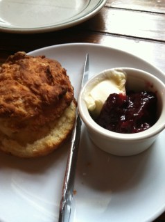 We arrived just in time to sit down at one of the rustic wooden tables and do a little people watching while we decided what to order. If you like stalking hipsters, this is premium hunting ground. I saw enough plaid to outfit an entire Scottish clan in kilts for every day of the week. Matt and Jen started by sharing a sticky bun that I didn’t try but was apparently good enough to make Jen linger by the door on the way out, debating whether or not to get another one for the road. It wasn’t that it didn’t look good, but I had my own breakfast pastry on the way. A fresh Southern style biscuit soon arrived that was warm, fluffy, and the perfect vehicle for the homemade jam served alongside it.