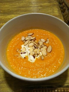 - The Dish: Samantha (Molly Ringwald) makes her mom pack carrots in her lunch every day because she thinks they’ll help increase her bust. As a painfully flat-chested high schooler myself, this piece of the movie and the burning desire to transition from girl to woman always stuck with me. Since carrot was the most stand-out ingredient in the film, I decided to make a carrot ginger soup and found one on epicurious.com that looked both simple and flavorful (well, technically, I combined the best parts of two recipes). I hauled out my soup pot and started sauteing onions in butter. After a few minutes, I added garlic and ginger and let it go a few more minutes before I added chopped carrots, tomato, and lemon zest. Once all the main ingredients were in the pot, I added chicken stock, brought it to a boil, and then let it simmer for about 20 minutes. At that point, everything was properly cooked so I just blended it until smooth, adding in extra chicken stock until it was the right consistency. I topped it with a dollop of sour cream and sliced almonds (pine nuts would have been better, but I had almonds on hand). Ginger is usually spicy, but when combined with the sweet carrots and onions it just makes the soup a little zestier. It’s thick and rich without any cream, making it completely healthy. If you want to be super good, use fat free greek yogurt instead of sour cream for that velvety tang.
