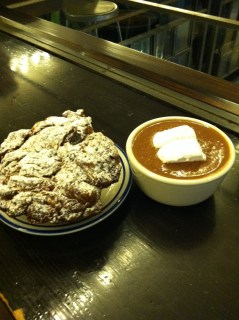 Lindsay and I met at City Bakery for a sweet snack yesterday, and I can honestly say I’ve never had hot chocolate like that before. It’s basically a melted Hershey bar. It was so unbelievably thick that I could barely put a dent in my small cup. To be honest, it was too rich. I couldn’t come close to finishing it, and then I felt bad about wasting it because it’s not a cheap cup. The best part was the huge homemade marshmallow. That’s worth the extra dollar. Next time, I’ll get the shot size and one of those marshmallows. Trust me, a shot is more than enough of the drink and then you still get to dunk the fluffy, gooey mallow. They also have a bunch of sweet baked goods (I got a muffin; Lindsay got a cookie) that practically seem savory next to the hot chocolate. If savory is what you want, I also spied salads and mac and cheese. These normal lunch items looked good, but they won’t bring out the kid in you like the hot chocolate.