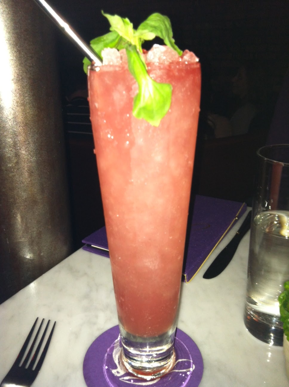 The walls are dark brick and subway tile and the seating is a mix of huge round booths, two-tops, and a high, long, communal table. We were seated at this long table where we befriended our neighbors and tried each others’ drinks. I tried the JBird Swizzle, which I think sounds like a dance from the 50s, and Lindsay ordered the Thornybush. I can’t remember what came in each of the cocktails (mine had a splash of pineapple juice, Lindsay’s had kaffir lime and a bay leaf), but I can tell you that there was a nice eye for detail in each of the drinks, like the metal straw in mine.