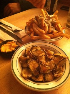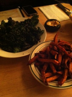 The sides all looked great so we ordered four of them. You’d think that was excessive, but we ate them all, so I think it was just right. The fried pickles were sliced very thin and very lightly fried – the most chip-like fried pickles I’ve ever had. The chipotle dipping sauce was good as always, but then it was on to something else with a sauce: blue cheese fries. You could tell they used good quality blue cheese and made their own dressing from scratch. This was neither just crumbled blue cheese nor overly creamy bottled dressing. Cheese fries are common on a menu; blue cheese fries…not so much, but they should be. We also ordered sweet potato fries. They were good but not as exciting as the first two appetizers or our final choice: crack kale. The kale was fried so it was all crispy and slightly sweet. It disintegrated on your tongue like cotton candy. Do I need a deep fryer to make this happen? If so, I should invest in one or perhaps just go back to this restaurant more often.