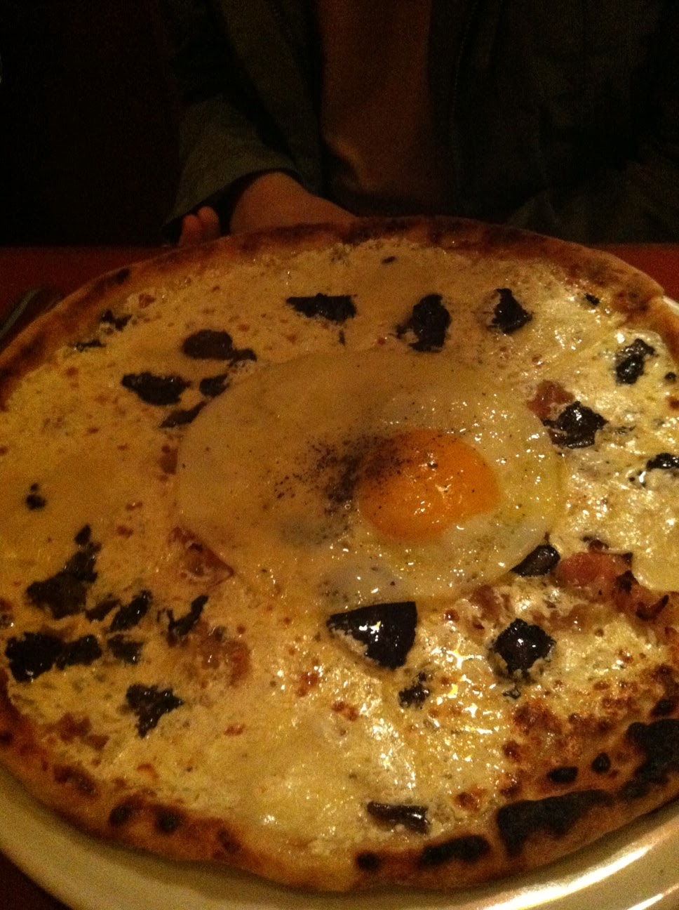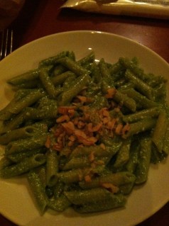 Amy and I decided to go splitskies on a pizza and pasta. The first half of our combo was the pizza special with an egg, black truffle, and some sort of cured meat. I love their super thin crust, perfect amount of cheese, and believe it or not an egg is the perfect topping for a pizza. And don’t forget that shaved truffle. That topping made this pizza double the price of the others on the menu and it tasted great, though I’m not sure if it tasted doubly great. We also ordered penne with a parsley, mint, and walnut pesto that got me nice and ready for spring. The best part of the pasta was scooping up the leftover sauce with the bread…but isn’t that the best part of every pasta dish? As good as our choices were, I think Karina wins the best order award. Her pasta special of bucatini with stinging nettle pesto was incredible. I don’t know what a stinging nettle is other than the waiter’s description of it as an “herbaceous plant,” which didn’t help much. What I do know is that once pureed with pine nuts into a pesto, it has a deep uber-spinach-y flavor that I loved.