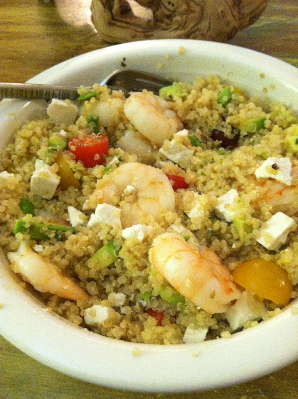 Mix quinoa, halved grape tomatoes, avocado, ricotta salata (or feta if you can’t find it), and shrimp. Then toss with a dressing of olive oil, lemon juice, honey, oregano, salt, and pepper. That’s it. I let the rice cooker do all the work with the quinoa and only had to bother myself to chop the tomatoes and avocado. I bought raw, cleaned shrimp and those suckers take approximately one minute to boil up. I can’t think of a single other thing I can do in one minute. Tie my shoes, perhaps? Only on a good day.