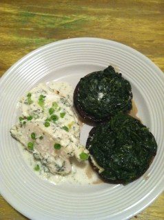 I served it with portobello mushrooms that I stuffed with creamed spinach. If you want the easy way out, buy frozen creamed spinach. If you want a healthier version where you control the amount of cream and cheese, make it yourself. It couldn’t be much easier to wilt spinach, add some cream, parmesan, nutmeg, salt, and pepper. The flavor of the fresh spinach is much stronger than its frozen friend and it takes about the same amount of time to prepare.