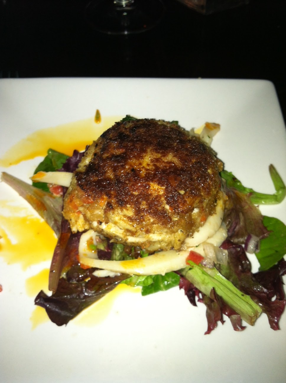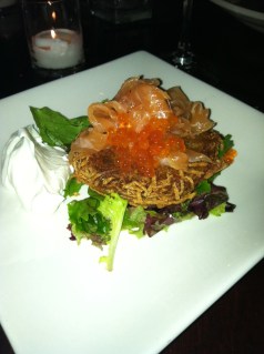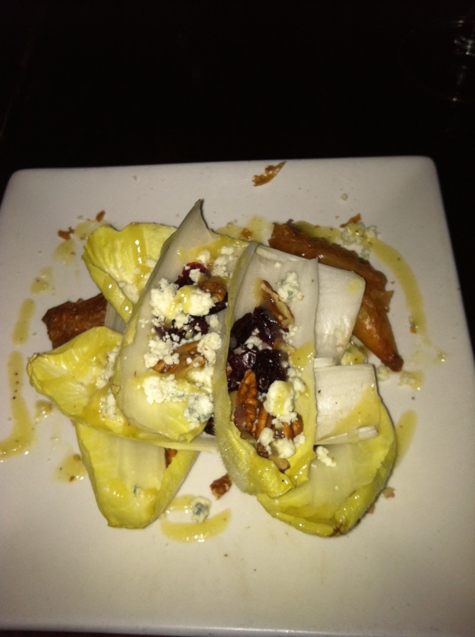 I decided to get to appetizers for my meal.  The first was a crab cake over a heart of palm salad.  The crab cake had a great meat to filler ratio and began to fall apart as I pierced it with my fork, an indication that there wasn’t too much breading attempting to hold it together.  Next I got an endive salad with pecans, gorgonzola, dried cranberries, and a pear vinaigrette.  The flavors complimented each other, but it needed a little more dressing to bring it together.  I also tasted a bite of the potato pancake topped with salmon gravlax and caviar.  I know it was listed as “crispy”, but I thought it was just a little too crunchy and probably shouldn’t be called “famous”.  I do, however, like the idea of potato pancakes with different toppings.  Just take them out of the pan 30 seconds earlier and you’ve got a great appetizer on your hands.