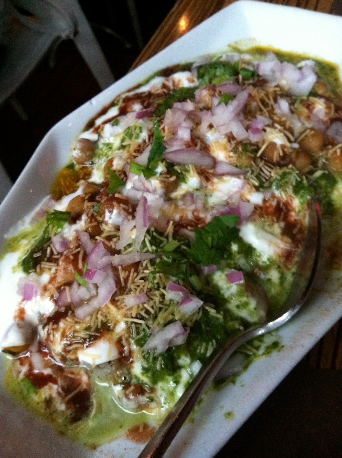 I knew I wanted to order a chaat, which is pretty much a chaotic mess on a plate. Typically I don’t like sloppy food with everything mixed together. I usually like my food not touching so I can mix it as I wish – I guess that’s the control freak in me. However, after an Indian friend ordered it for me at a restaurant and told me I had to eat it, I learned I could enjoy a pre-jumbled mess. We went with the aloo tikki chaat, which is potato patties topped with yogurt and chutneys. It started the meal on a super high note.