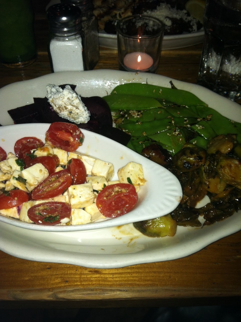 Although many of the dishes (like chicken or salmon) come with your choice of a couple sides, I couldn’t narrow down the list so I ordered a plate of four sides for $14. The goat cheese that came with my roasted beets was nice and herby and the tomato/mozzarella is a tried-and-true summer dish, but my two favorites were the snow peas with sesame and ginger and the honey dijon brussels sprouts. I gobbled up everything but didn’t feel bad about it because it was all relatively healthy.