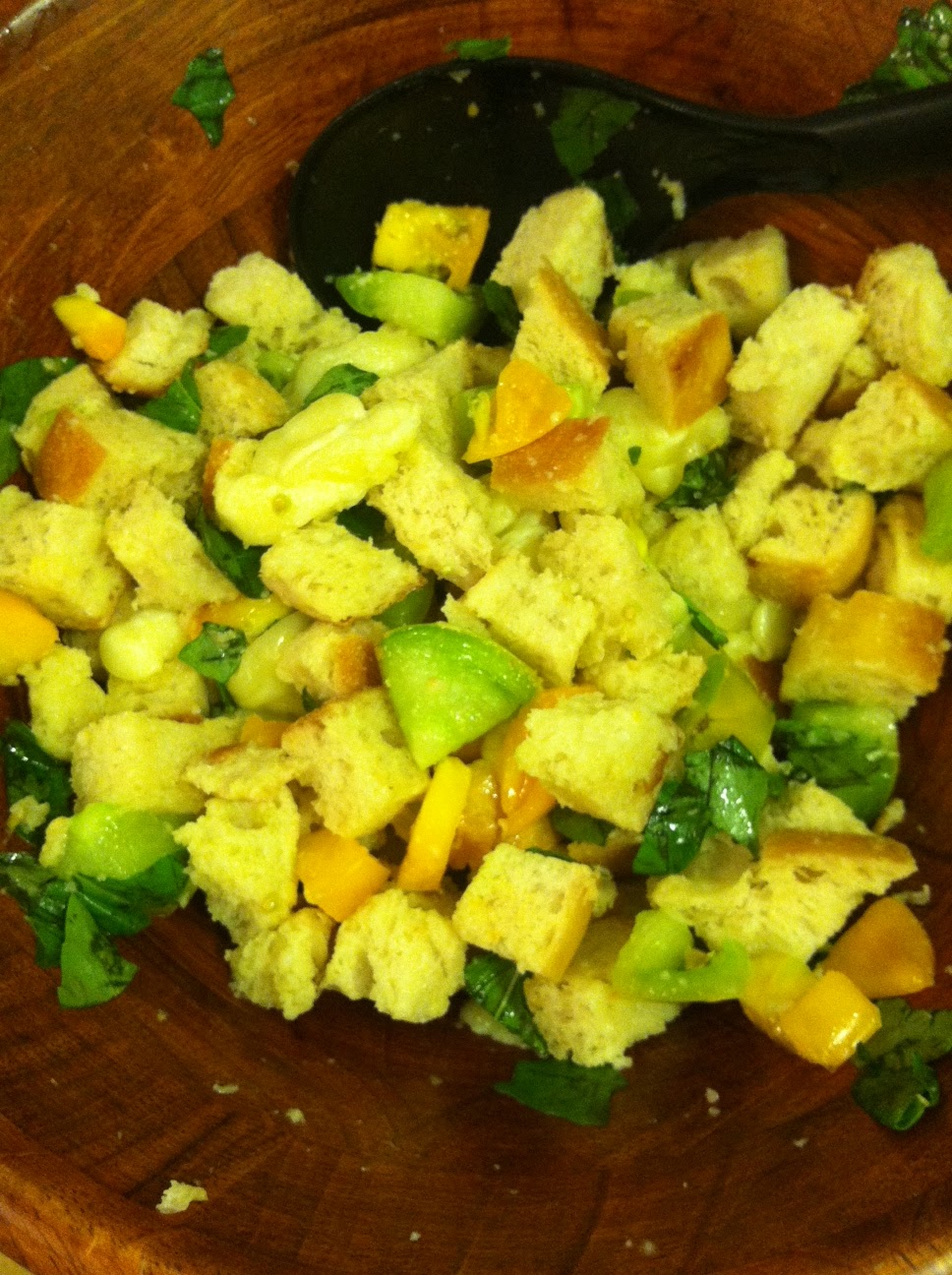 While your tomato mix is chillin on the counter and your bread is finishing up, it’s time to prep the final ingredient. I love heirloom tomatoes, but I see plenty of recipes for them this time of year. What I’m not accustomed to seeing is a recipe that uses cheese curds. I’ve never had a curd of any type and thought they existed only in the land of Lil Miss Muffett. Or Wisconsin…same thing. Is there anything in Wisconsin other than cheese curds and the Packers? Who cares, now that I’ve tried cheese curds, I could move there. It’s just good, cheesy cheese. It tasted of America ::sigh::. The recipe called for the curds to be grilled, but in my case, this meant I used an oiled skillet. Let them get melty on the bottom but still in tact on the top so they can be mixed into the salad as chunks.