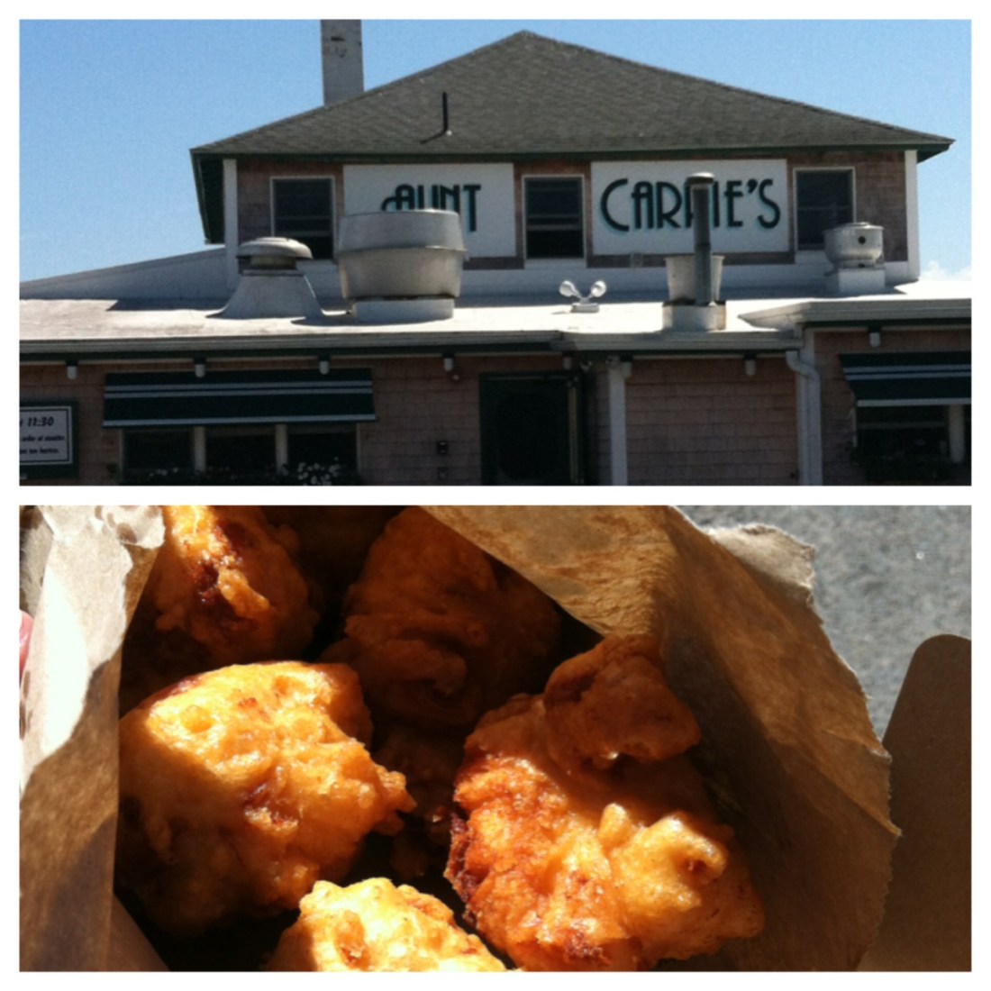 We picked ours up from Aunt Carrie’s, which [according to local Sam] is supposed to be the best.  They recommend dipping them in clam chowder but we were still too full from breakfast.  That was a big mistake on our part because I could tell how good it would have been.  They were also a cheap snack: less than $4 for half a dozen huge balls of fried dough.  If you are trying to convince yourself these aren’t terrible for you, you’ll have a hard time as you try to wipe away the grease that results from pulling these straight out of the deep fryer.  A heavy snack like this doesn’t seem easy to handle on a hot day, but greasy fingers are no trouble when you get to wash them right off in the ocean.