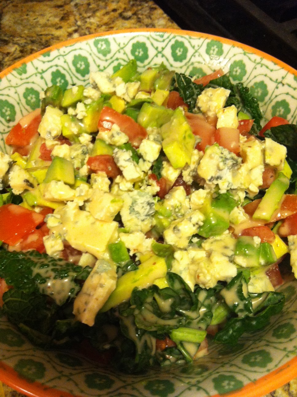 Trader Joe’s had a bag already washed and chopped, but I gave it another run-through with the knife to make it a little more manageable on the ol chompers. The rest is super simple but made for a truly fabulous salad: tomato, avocado, gorgonzola, and Trader Joe’s light champagne vinaigrette. You can mix it up when it comes to the dressing, but do what i did and pick something that’s a little thicker than a normal vinaigrette so it breaks down the kale and keeps it from overpowering the salad. Seriously, this salad was pretty close to perfect. I could see edamame or some sort of bean also working but not necessary. Make this. Now.