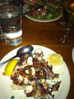 The night my parents and grandmothers arrived I wanted to stay close to home for dinner so I picked Ethos for what I think is solid Greek food. My father would call it more than solid. He couldn’t stop talking about how it reminded him of the tavernas he loved so much in Greece and told the waiter (his new best friend) as much. We ended up ordering a bunch of appetizers to share around because those are some of our favorite dishes (and for my father, the most reminiscent of taverna fare). All four spreads we tried were good, as was the shepherd’s salad. My La La slurped every bit of her avgolemono (chicken and lemon) soup and the dolmades were quickly snatched picked off the plate. I wasn’t crazy about my spanikopita triangles (a little too much phyllo), but they were redeemed by my plate of salty, tender grilled octopus.