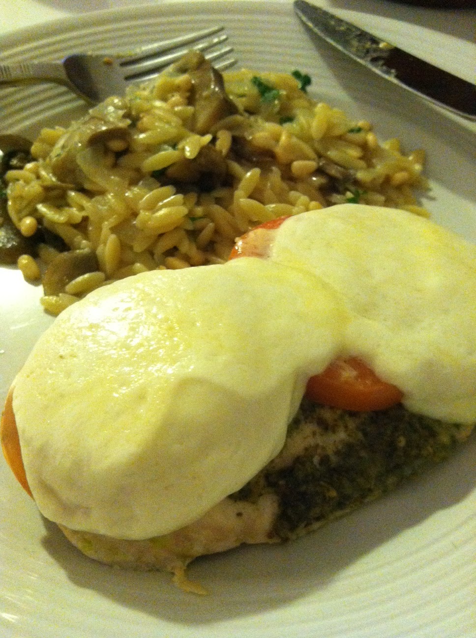 The first recipe came courtesy of SkinnyTaste. First, buy the boneless skinless chicken breasts that have already been cut thin. This serves two purposes: 1) portion control and 2) quick cooking time. Top the chicken with pesto and stick it in the oven for 15 minutes at 400. Take it out, top with sliced tomato, sliced fresh mozzarella, and freshly grated parmesan. Stick it back in the oven for about 5 minutes so the cheese can melt. While you’re cooking the chicken, saute mushrooms and onions in olive oil. When they look like they’re good to go (about 10 minutes), add 2 cups of chicken broth. Once that starts boiling, add a cup of orzo, reduce the heat, and let it cook for about 15 minutes until the broth is absorbed. When it’s done, stir in fresh parsley and pine nuts. The resulting pilaf is super flavorful. Using chicken broth instead of water makes a huge difference (and it’s low sodium – healthy high five!).