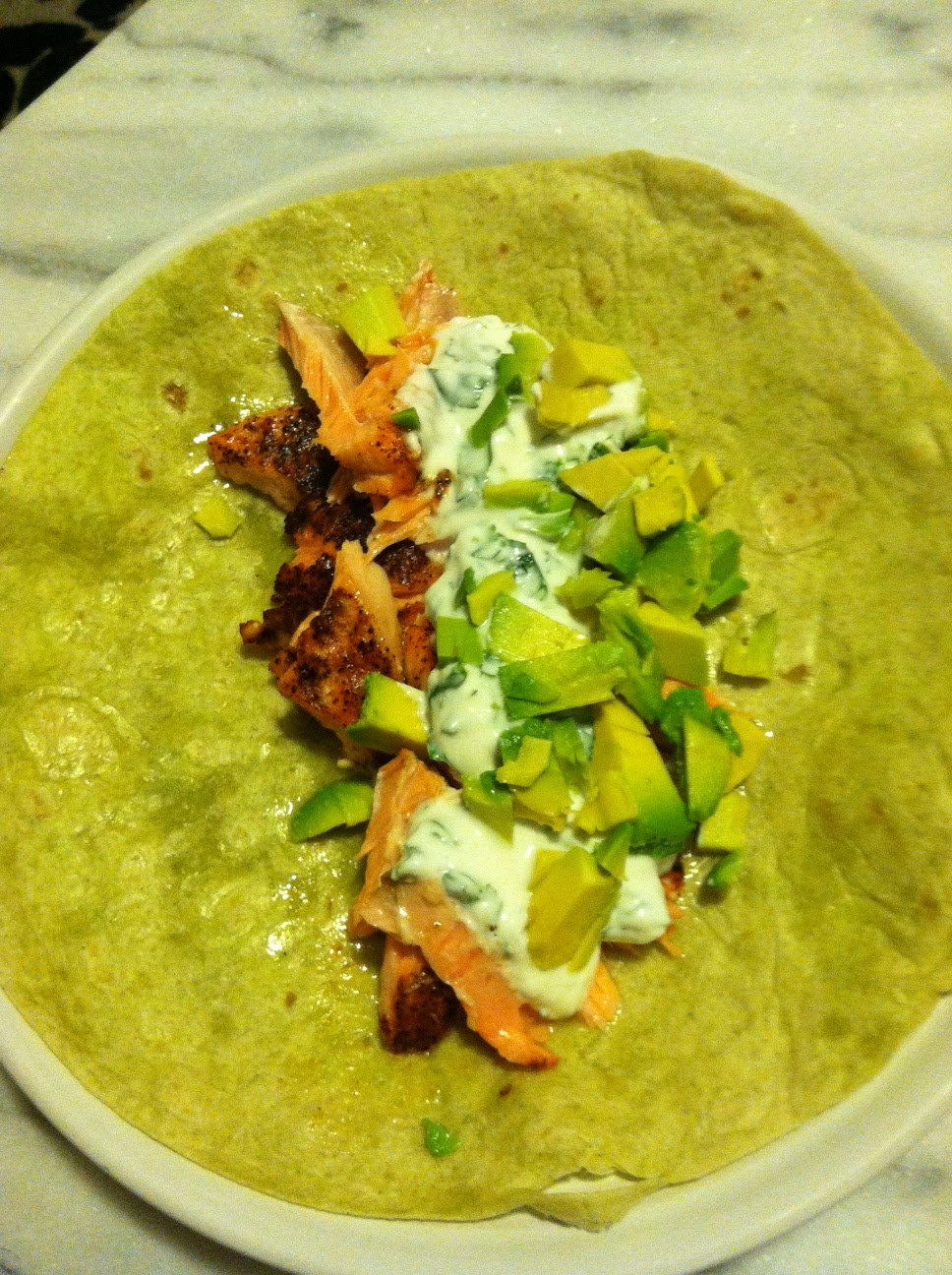 I drizzled salmon with olive oil, topped it with chile powder, paprika, and cayenne, and stuck it in the oven to bake while I separated and loaded my laundry into the machines. It still had some time left to cook after I started the wash so I prepped the toppings while it finished cooking. I made a sauce by mixing greek yogurt, cilantro, lime, and salt. I also chopped up an avocado. I then ran down to put my clothes in the dryer and by the time I came upstairs, the salmon was ready to come out of the oven and the tacos were ready to be assembled.