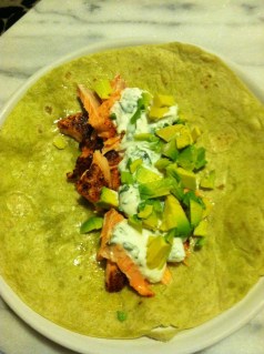 If I’m able to cook a healthy, delicious dinner while I’m doing laundry and haven’t even gotten back from the gym til 9:00 pm, I’d say that must be one worthwhile recipe. Salmon tacos are just that.