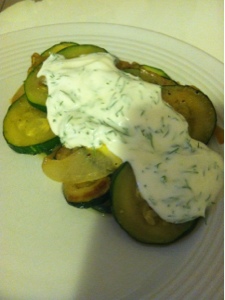 I mixed some greek yogurt with lemon, salt, pepper, and fresh dill and spooned the sauced over the zucchini. It was exactly what I was looking for. My zucchini no longer tasted all boring, but I didn’t have to tap into the queso to make it feel like it was worth eating.