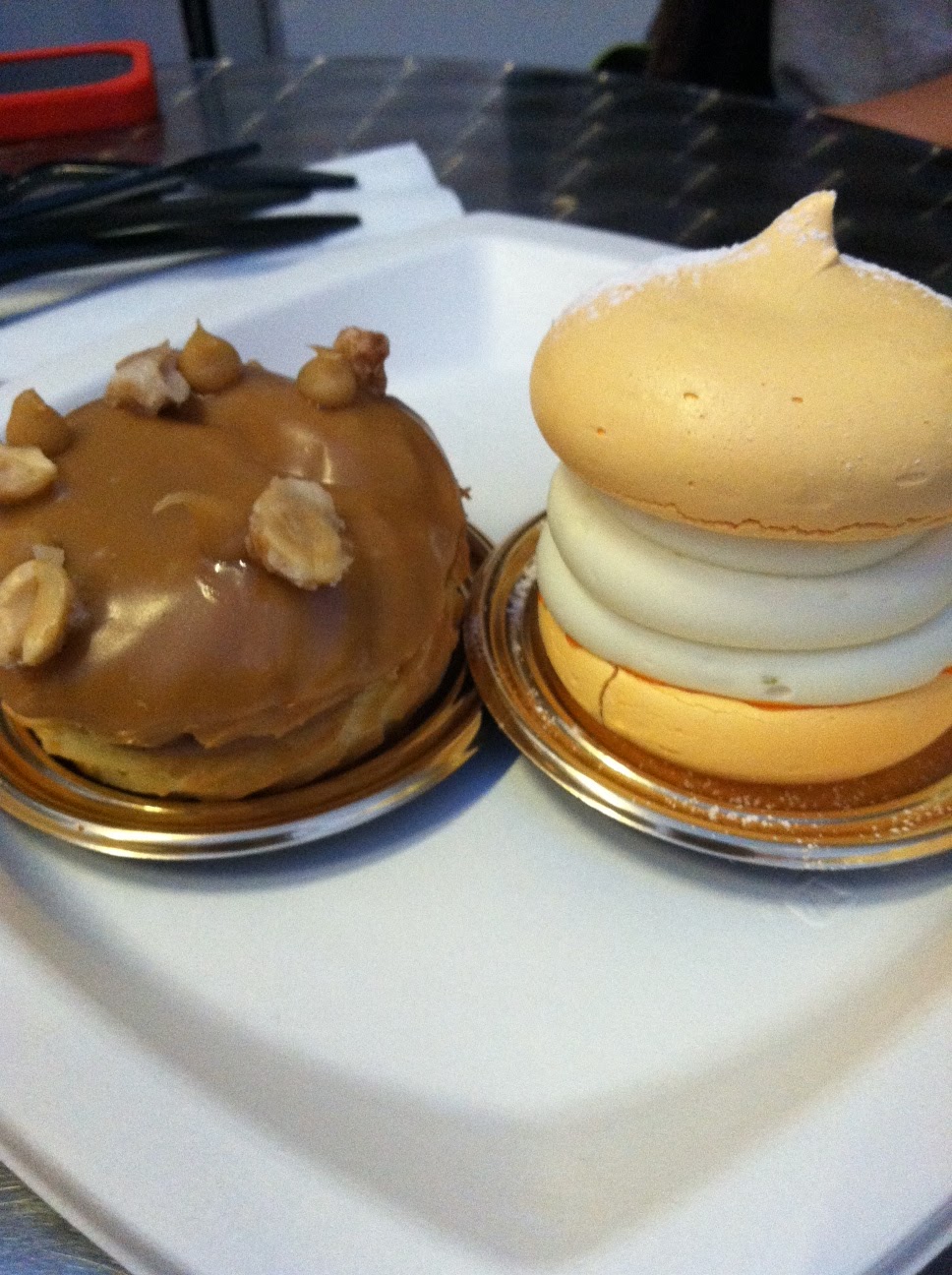 Each item in the case looked perfectly crafted. Karina and I allowed ourselves to try three desserts and even though that sounds like a lot, it was an incredibly tough decision because they all looked so mouthwatering. Karina’s favorite dessert is the eclair so that was choice number one. In addition to the chocolate icing, the pastry was filled with chocolate cream and topped with a long rectangle of chocolate. Unlike Karina, eclairs are not my favorite, yet I may have eaten more than she did. My complaint is usually the cream filling – I don’t like whippy icing/filling, but this was a little thicker and in perfect proportion to the pastry encasing it that it basically changed my outlook on eclairs. After having read about it a few months ago, my choice was the Paris-New York. I’ve never had the original Paris-Brest for comparison, but Ansel’s take made with caramel, chocolate, and peanuts was the perfect salty/sweet dessert. For our third choice we wanted something fruity that wasn’t anchored in pastry for a little variety. Karina and I both like macarons so we went with something meringue-based. The banana passion fruit pavlova sandwiched flambeed bananas with coconut lime cream between two passion fruit meringues.