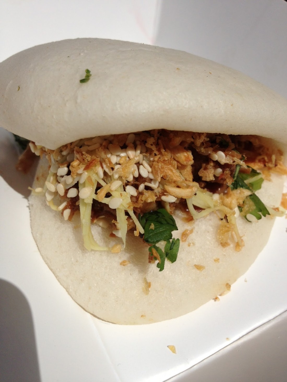 When I hit up Smorgasburg for the first [but obviously not the last] time this season, I was determined to try at least one thing I had not eaten there before. The winner was Bite Size Kitchen, a catering company that specializes in Asian inspired apps. On their Smorgasburg menu were four different types of steamed buns. Though I was tempted by that naughty siren, pork belly, I decided to go with the duck. It was so tender that it became one with the soft bun. But then those sesame seeds, fried garlic, and shallots jump out with a little texture because nobody likes a one-note bun.
