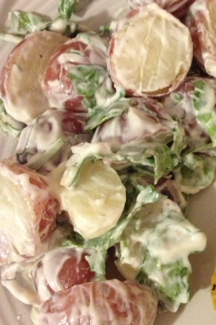 Cut up small red potatoes into bite size portions and boil til fork tender. While they’re boiling, take a few moments to exert the only real [minimal] effort this dish requires: cut shallots super thin and mix your dressing. The dressing is just 2 parts greek yogurt to 1 part low fat mayo and salt/pepper to taste. It’s so simple but when these two ingredients come together, you have a tangy sauce that seems like it has more layers than it actually does. Drain your potato chunks and run them under cool water to bring them closer to room temp. Toss the potatoes with the shallots, dressing, fresh dill, and roughly chopped arugula.