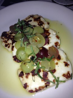 Richard, always ready to try something new, was good to go without hesitation and when I realized the menu was influenced as much by Israeli/Mediterranean cuisine as it is by traditional Jewish food, I was much more intrigued. Drawn to that Mediterranean food, I went straight for the Haloumi appetizer. The salty cheese was topped with sweet grapes for a light start to the meal. It was gone way too quickly. I followed it up with the kefta kebab, meatballs served with hummus, tahini, and pita slices. It was fabulous and reminded me how amazing hummus can be when prepared by people who know how to do it. Richard loved his catch of the day (whole branzino with cous cous) and slurped down his matzah ball soup.