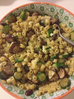 I was right on one part: it was so easy to prepare. I was wrong when I thought it wouldn’t taste that good without a sauce. The brie becomes the sauce. While the pasta boiled away (I recommend using bowties or some short pasta), I sauteed cremini mushrooms and zucchini with thyme. Everything finished cooking at about the same time so I threw it in a bowl and then added brie that I had sliced into small squares in the hopes that it would start melting. It did. It melted into cheesy velvet.