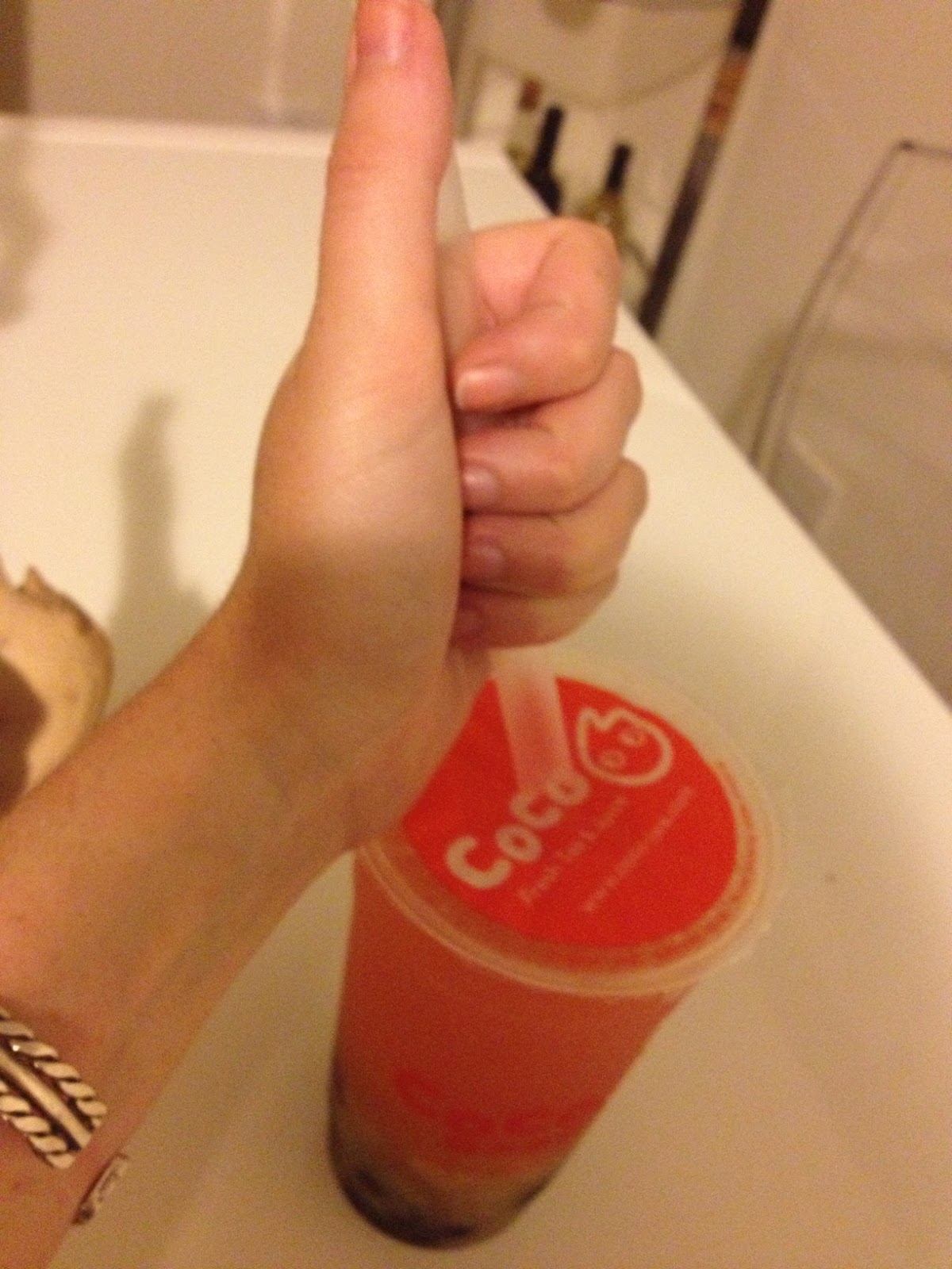 | One of the best parts about bubble tea is puncturing the plastic film with that fat straw. |
