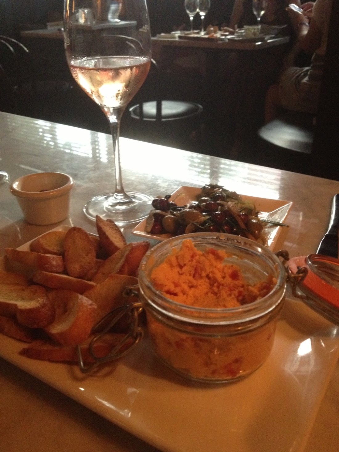 We ordered the olives because Albert is obsessed with olives. Only two varieties on the plate but they were two goodies, made even better by the olive oil they had been soaking in, which was infused with rosemary and thyme. We also ordered the pimento cheese because that one is my obsession. I still think mine is better, but they did a great job on theirs and served it in a cute jar. It was weird to have this Southern dish on a predominantly French menu, but I never complain when pimento cheese is on the menu.