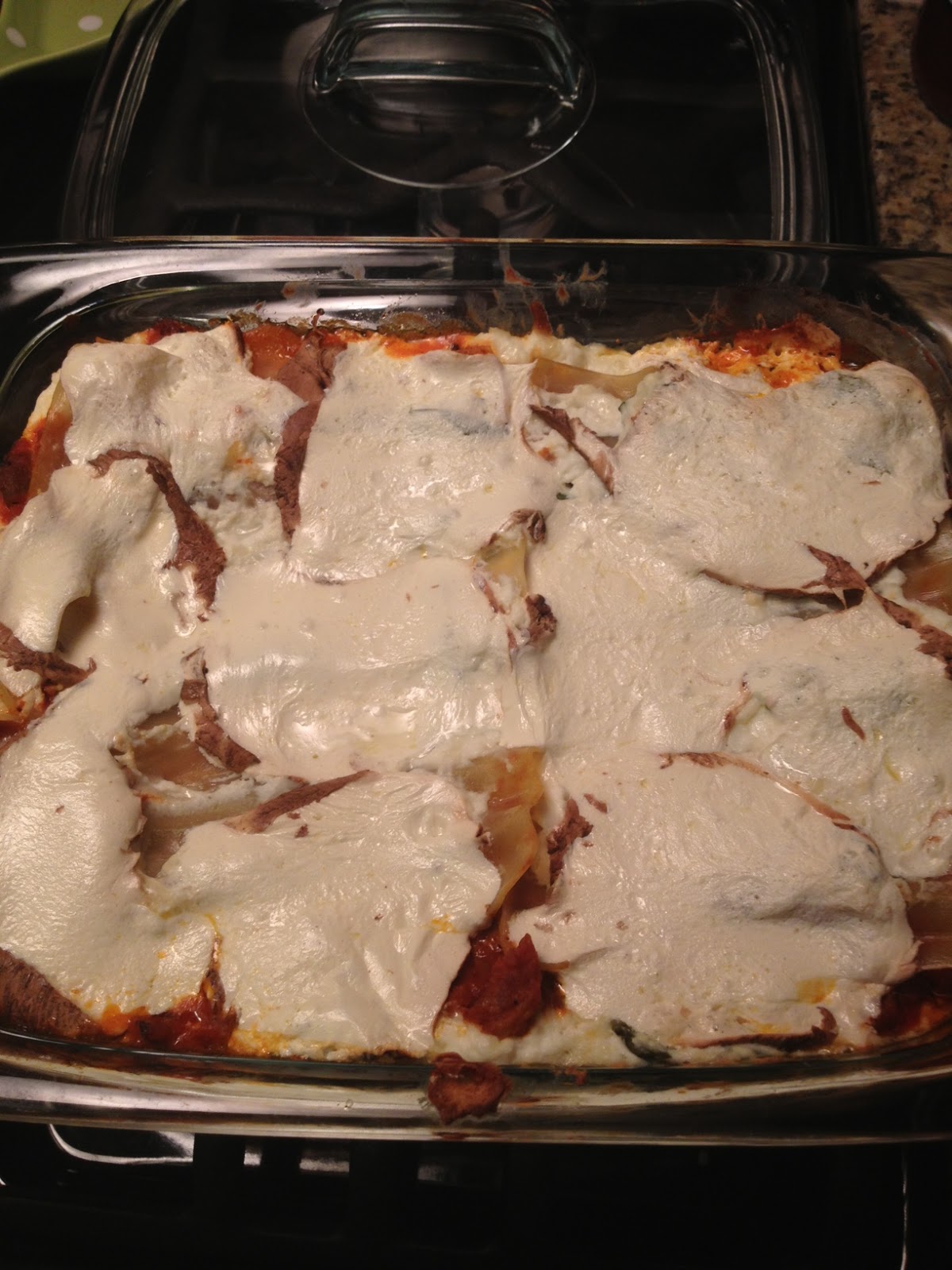 First, instead of ground beef, I removed fresh sausage links from the casing, crumbled them, and browned them in a pan. I used a one to one ratio of hot and sweet Italian sausage but that came out pretty spicy so you may want to use more sweet than hot if your palate prefers the mild. Once it was cooked, I added some of that jarred sauce to the pan to heat through and then used some of the meat mixture as the first layer in my lasagna pan. Next comes a layer of noodles, followed by fresh ricotta that I mixed with shredded mozzarella (whatever cheap bag you find in the refrigerator aisle) and torn basil (fresh herbs add so much great flavor). I repeated each layer a few times until the ingredients were used up and then topped with the whole thing with slices of smoked mozzarella. It went into the oven at 350 til it was nice and bubbly (about 30 minutes).