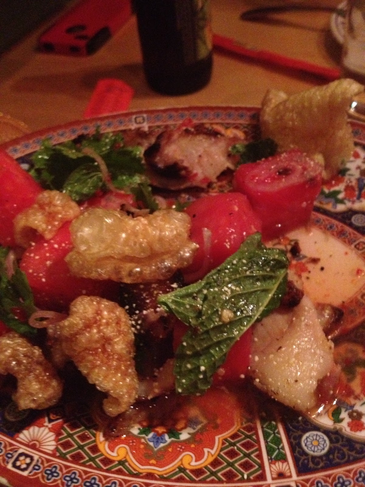So I made good on the price condition but the real concern was getting my brother and sister in law unique food. I did even better in this category. We ate pork head served with a slippery, saucy egg. It was fatty, sweet, and salty. Definitely can’t get pork head in Savannah – it’s not like it’s on tons of menus in New York either. It was gone moments after it was placed on the table. We debated getting another order immediately but decided to wait until after we tried the other dishes that were on their way from the kitchen. It’s a good thing we did because the following dishes were also spectacular. The pork jowl was served with cilantro, mint, watermelon, and chicharron. When all elements were eaten together the sweet and cool watermelon did something with the spicy pork jowl that got me all sorts of confused and excited. I know it sounds like a lot of pork, but you haven’t even heard about the pork belly yet. It was served with a poached egg in a salty broth that didn’t mushify the crispy skin. Finally, we ordered the curry fried chicken special that was served with a pickled watermelon rind salad. The sauce was sweet and unlike the curry flavor I was expecting and the skin was crispy enough to satisfy our whole table of Southerners.