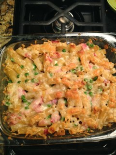 I thawed frozen peas in a pan with butter while my pasta boiled away and I prepped the other two – count ’em – two ingredients. Prepping is a stretch. Getting these ingredients ready takes no time. I simple cut up some deli ham (maple variety) and grated cheese. I used the Yancey’s Fancy champagne cheddar that I had on hand from a previous recipe and it was perfect. If you can’t find champagne cheddar, any bold, dry (in flavor, not texture) cheese will work. I would go with sharp cheddar, gruyere, or swiss. Basically, you just need something that will take down the sweetness quotient of the peas and ham. I like to add a little egg/milk mixture to help the whole thing bind, but it’s not necessary. Bread crumbs would also be nice but also not necessary. Combine it all in a dish and bake til it’s nice and casserole-like. Serve it with a nice salad and you’ve got yourself a meal, cowboy.