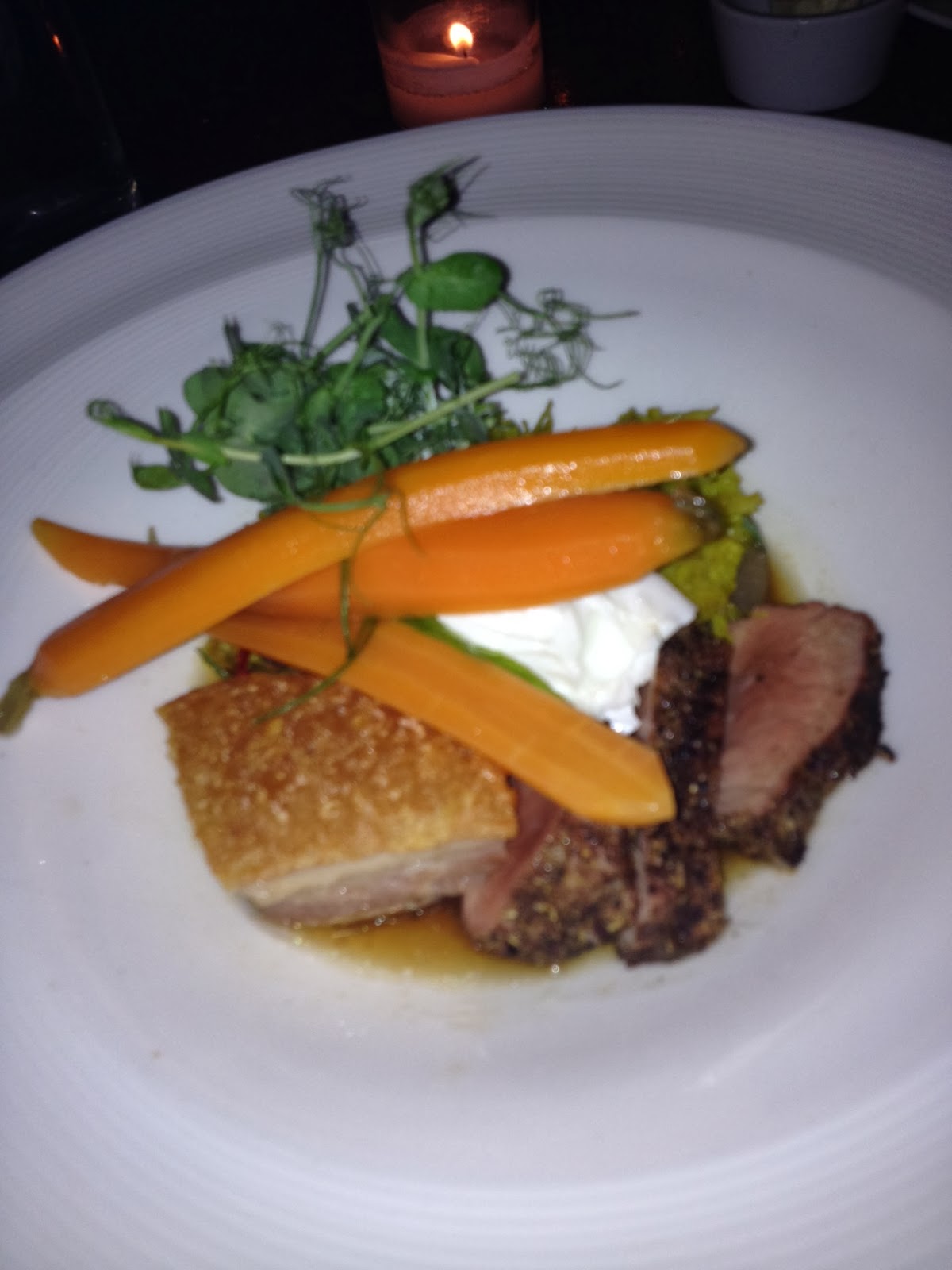 The cheapest wine on the menu was $12 so don’t go there for bargains. But I will say that my $12 glass was delicious…that’s why I had three of them. We decided to split an appetizer and an entree. Since we were sitting at the bar instead of a table, going splitzies just seemed appropriate. For the app we got the lentil salad with green beans, avocado, pecans, and pomegranate molasses. If you’re wary about lentils, you won’t be after eating this dish. For the first time, I wasn’t shoveling mocha colored mush into my mouth. It was absolutely delicious. We also split the pork tenderloin and belly with poached egg. The belly was incredible and made more decadent by the egg. The tenderloin had a bit too much peppercorn but was cooked perfectly.