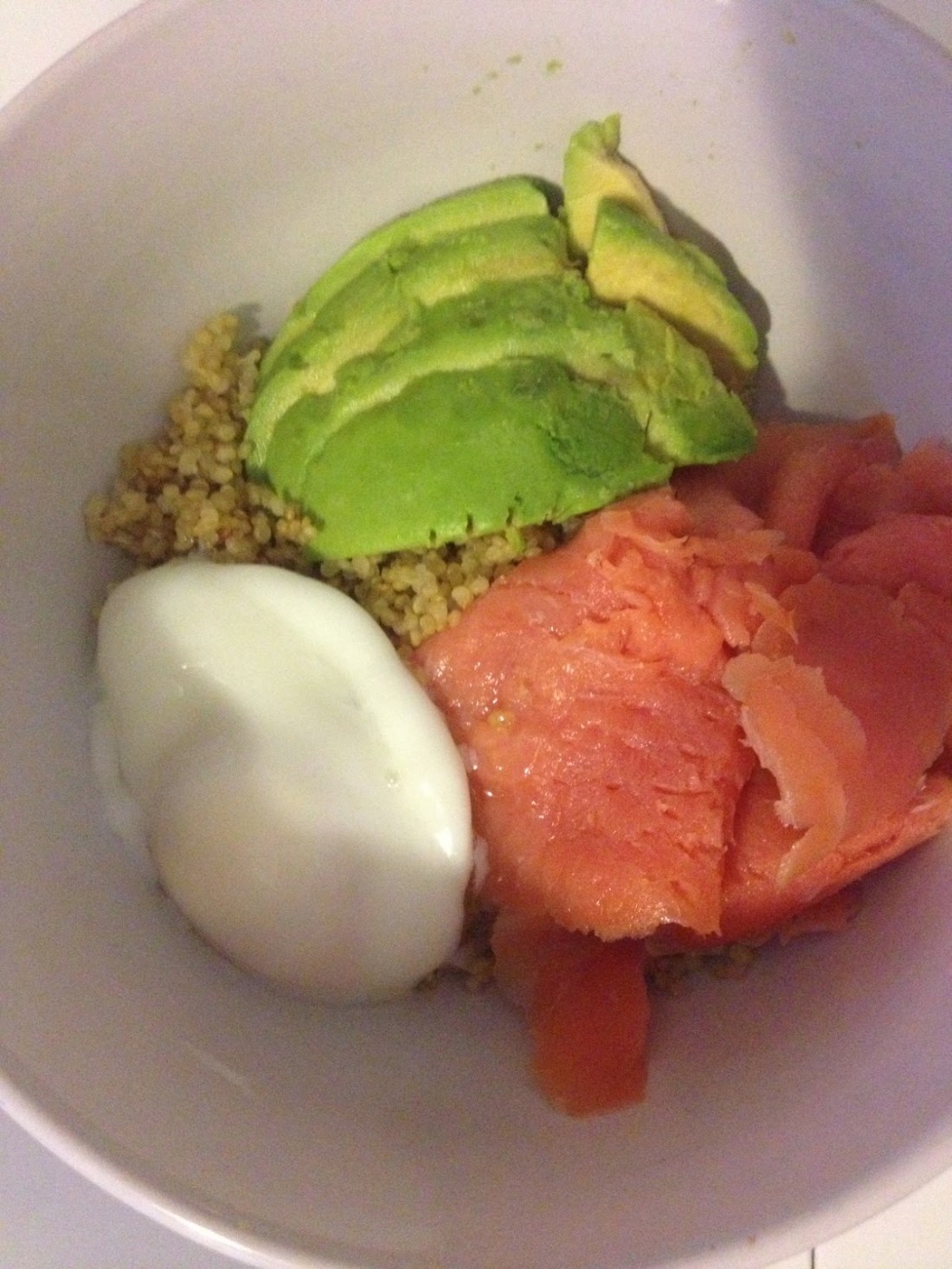 After reheating the quinoa in the microwave, I topped it with some avocado and smoked salmon. Finally, I got the egg ready. You can do a fried egg here, but I personally prefer poached because it’s quick, easier to clean up, and I discovered the most amazing trick. Eggs can be poached in the microwave. I KNOW. I found this nearly impossible to believe, but Bon Appétit said it works, and they’re pretty legit. Just fill a 1-cup glass/pyrex measuring cup with 1/2 cup water (you can improvise with the type of cup you use – I found this the easiest because of the handy dandy measuring lines). Carefully crack an egg into the water, making sure it’s totally covered by the water, and then cover the cup with a plate and microwave on high for about 1 minute. You may need more/less time to ensure firm whites and runny yolks. Then just use a slotted spoon to place your perfectly poached egg atop your quinoa bowl. All you need is a little salt and pepper and you’re good to go. Don’t even try to tell me that a breakfast like this won’t kick your day into high gear.