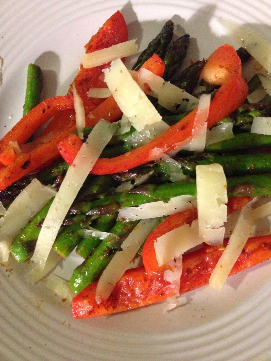 Finally! The weather has changed and that means there is new produce in season. Asparagus is a great veggie to use right now. You’ll probably see it everywhere this month from soups to pastas. I find that when something is in season, it requires very little fuss to turn it into a great dish. In this recipe for asparagus with bell pepper and manchego, you’ll just use four ingredients with almost no prep but you’ll turn out a side dish with a Spanish touch. Try to use smoked paprika if you can. I used the regular stuff and it just wasn’t the same. It was still delicious because, manchego.